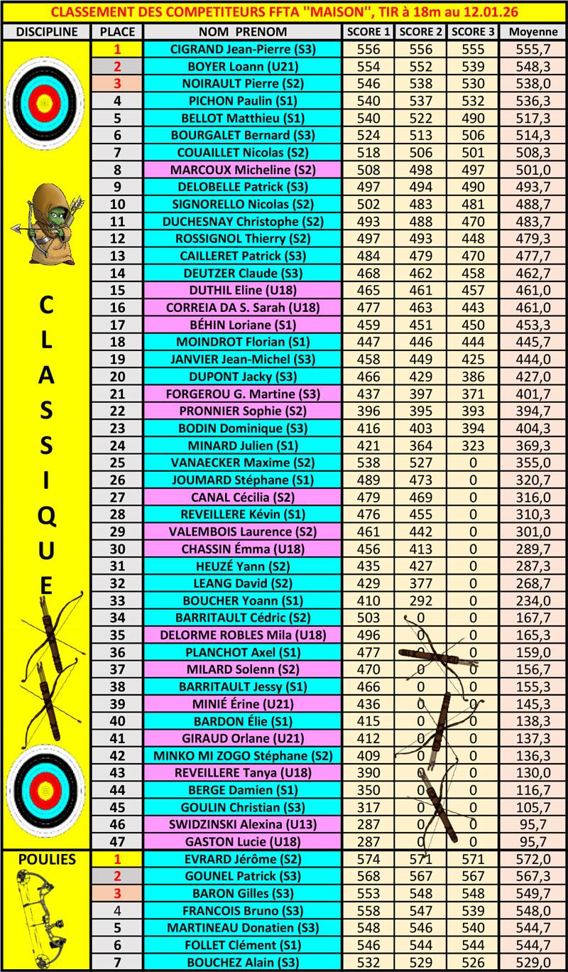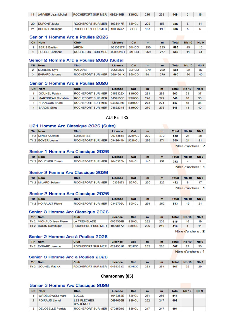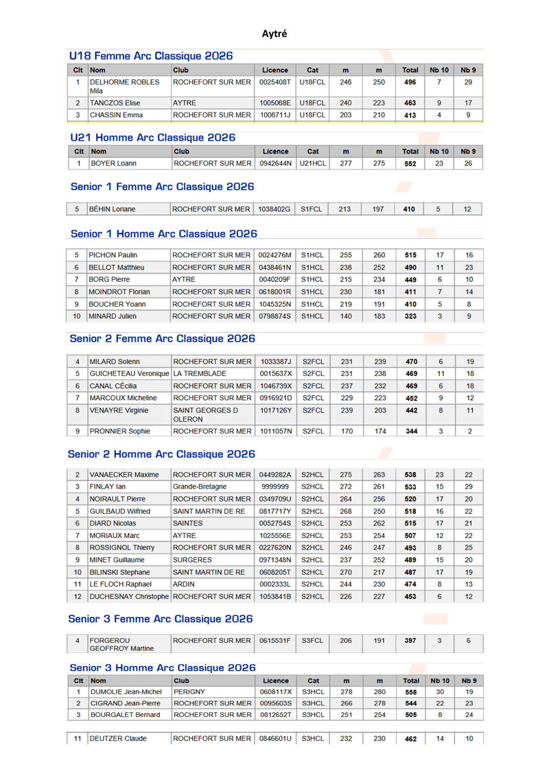 Retour sur les pas de tir. Après une semaine folle, sacrément perturbée, tout d’abord par l’épisode neigeux puis par les vents de ouf qui ont déplumé quelques arbres au terrain, pas moins de 30 archers Rochefortais ont envoyé de la flèche dans le gymnase d’Aytré !!! À une semaine du Championnat départemental, bon nombre d’entre eux ont affronté les trispots pour la première fois en « compète ». L’apprentissage fut délicat, pour les plus anciens également, qu’ils se rassurent. Les feuilles de résultats ci-jointes en attestent. Belle séquence d’entrainement avant le WE prochain du côté de Pons. Bravo à tous.