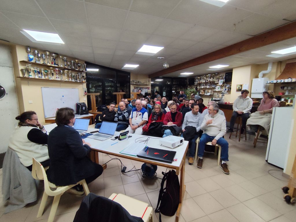 Le quorum est très largement atteint, puisqu’une cinquantaine de participants (manque de chaises !!!) étaient présents pour l’AG 2026. L’entame de la réunion fut, comme il se dut, à l’initiative de notre Président, Maxime, qui souhaita ses meilleurs vœux au nom de la Compagnie pour l’année nouvelle avant de décliner le rapport moral. Vinrent ensuite le rapport d’activité instruit par notre secrétaire, Lysiane, puis le palmarès sportif, avec remise de distinctions par Patrick, de la Com’ sportive, et le rapport « nickel » de notre trésorier « homme à tout faire », Donatien.