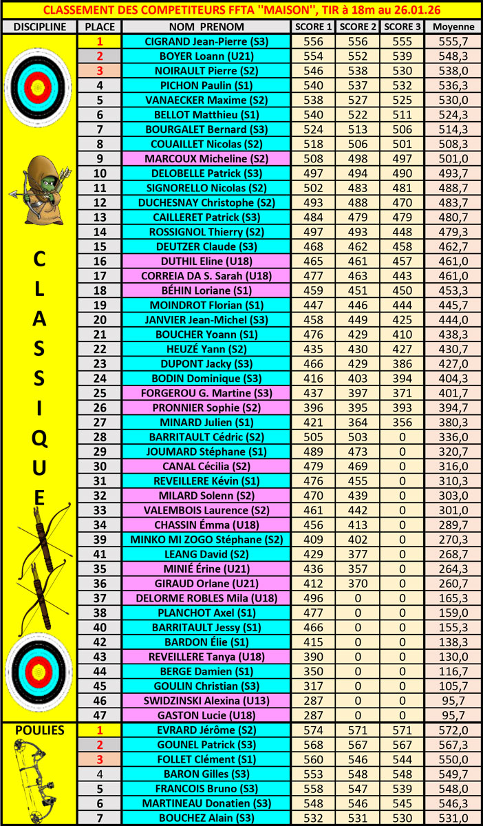 Pour cette ultime concours en salle de la saison 2025/2026, précédant les « Régionaux » et les « Nationaux », Honneur à nos trois « première année », qui ont entamé leur parcours sportif sur le pas de tir du gymnase du pas des laquais de La Rochelle, ce samedi soir, largement plus frais que notre Logis de la veille, aux fragrances « carbonadesques »… Bravo à eux, ainsi qu’au reste de l’armada Rochefortaise, qui eut bien du mal à se remettre, pour certains, des honneurs que nous fîmes à notre St-Patron… Nous retiendrons tout de même huit nouveaux podiums pour nos couleurs. L’ensemble des résultats à venir par notre com’ sportive et compte-rendu sur le site.